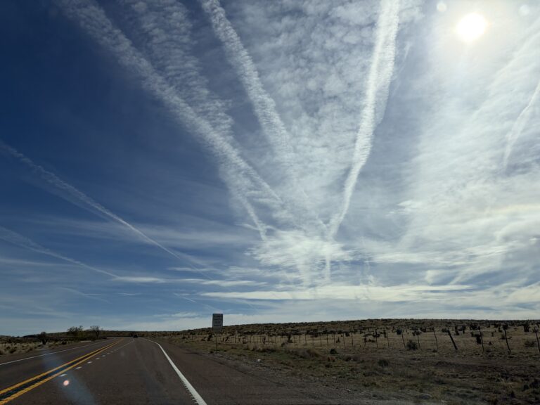 Dinah and I can tell you that the New Mexico sky is full of white trails going every which way. The one day with blue skies unsullied by white lines crisscrossing the sky, we ran into a woman in downtown Santa Fe who assured us that the government had simply run out of money to spread the chemicals. Now, maybe those white lines are just condensation from jets flying high .. but shouldn’t we all be asking questions as to whether they are more nefarious chemicals designed to, just sayin’, cause mass sterilization (explaining the declining birth rate in the US?), change the weather, or control our minds? You may think these are silly theories but then why are eight states considering legislation that would ban chem trails, including the great state of Texas?