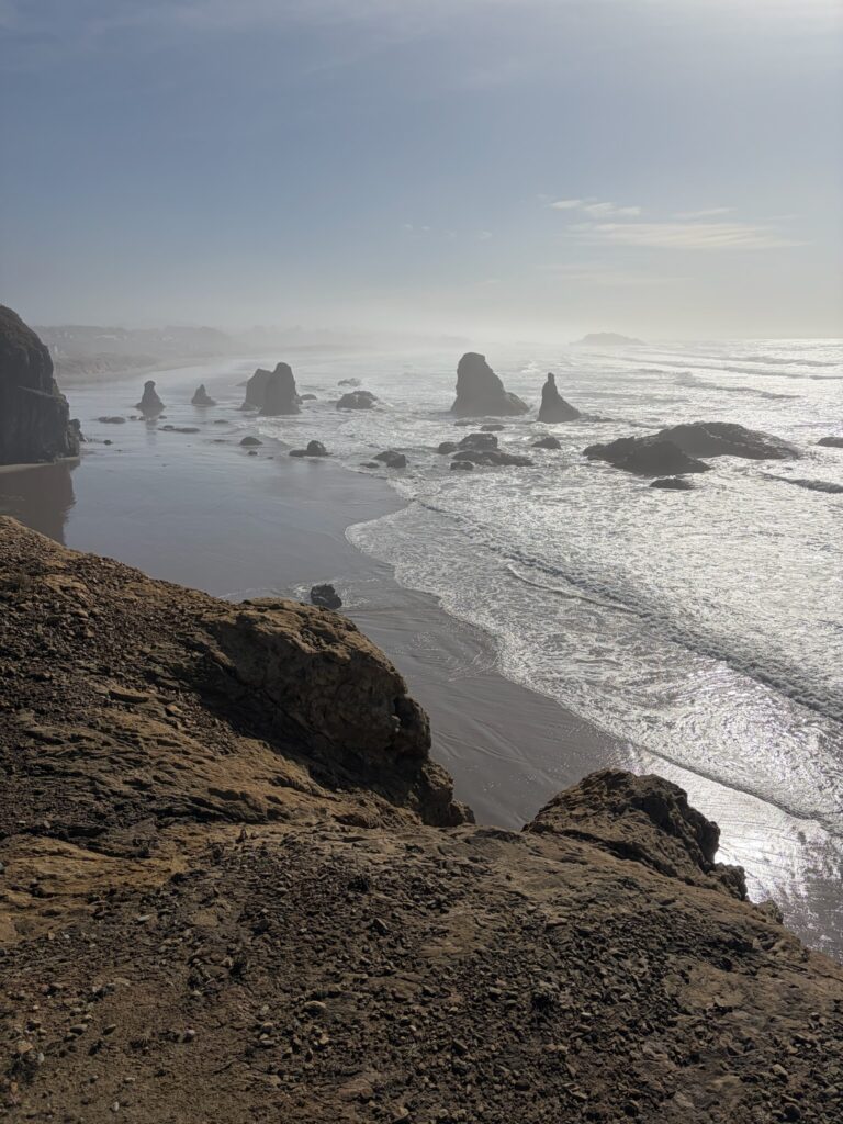 I liked this vista on the Oregon coast because it’s high, and out of the way of the giant tsunami that will hit when the Big One strikes. Driving highway 1 there are ‘entering Tsunami zone’ signs every few miles, as if you can actually escape a giant wave after a 8.5 earthquake, in six minutes, with a broken road and fallen trees.